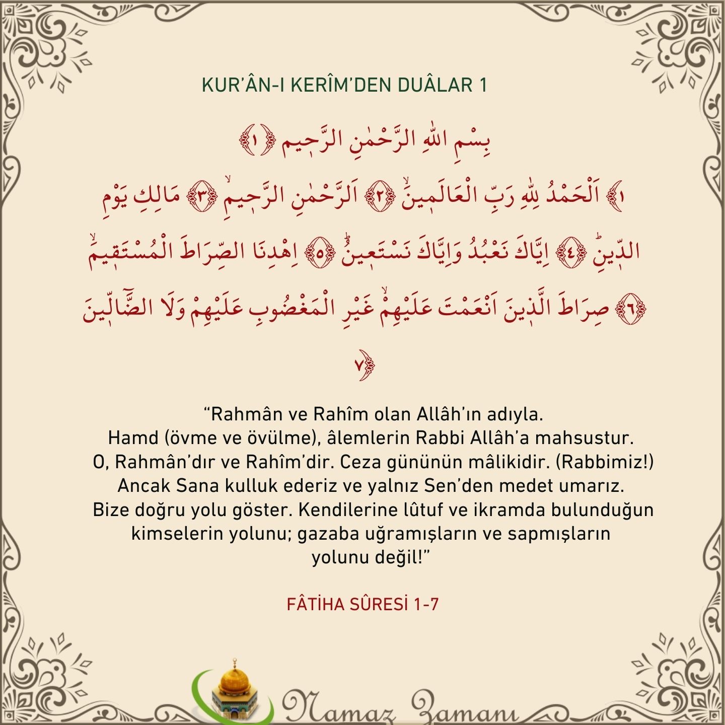 - Diyanet İşleri Başkanlığı: (2-4) Hamd , Âlemlerin Rabbi , Rahmân , Rahîm , hesap ve ceza gününün (ahiret gününün) mâliki Allah’a mahsustur.