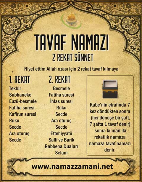 Kabe'nin etrafında 7 kez döndükten sonra (her dönüşe bir şaft, 7 şafta 1 tavaf denir) sonra kılınan iki rekatlık namaza namaza tavaf namazı denir.