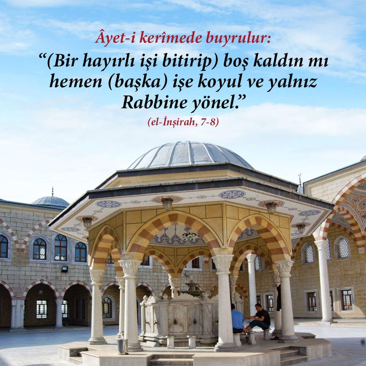 - Diyanet Vakfı: (7-8) Boş kaldın mı hemen (başka) işe koyul ve yalnız Rabbine yönel.