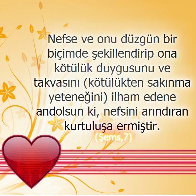 (7-9) Nefse ve onu düzgün bir biçimde şekillendirip ona kötülük duygusunu ve takvasını (kötülükten sakınma yeteneğini) ilham edene andolsun ki, nefsini arındıran kurtuluşa ermiştir.
