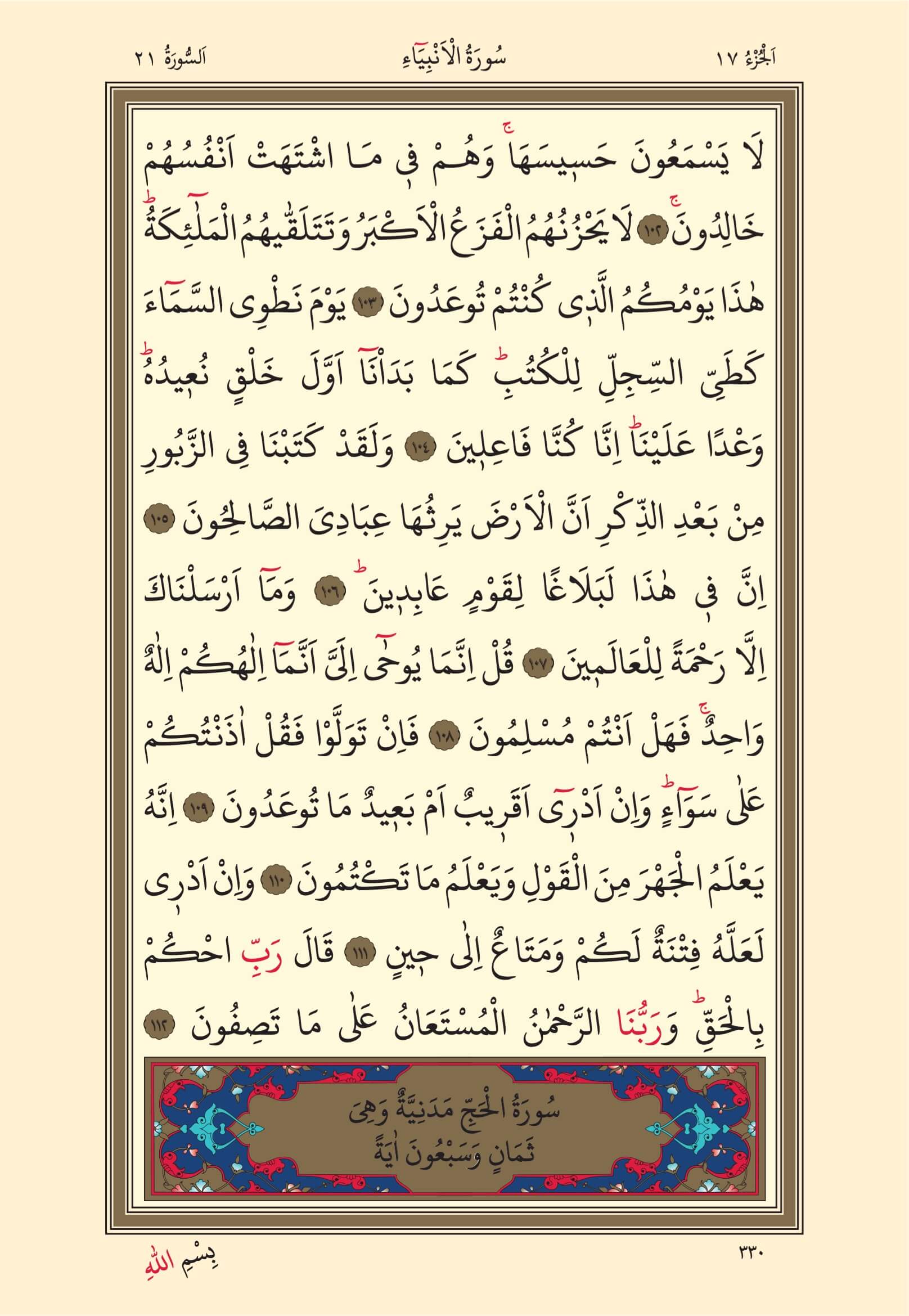 Enbiya Suresi – 330. Sayfa, – 17. Cüz - 3. Hizb