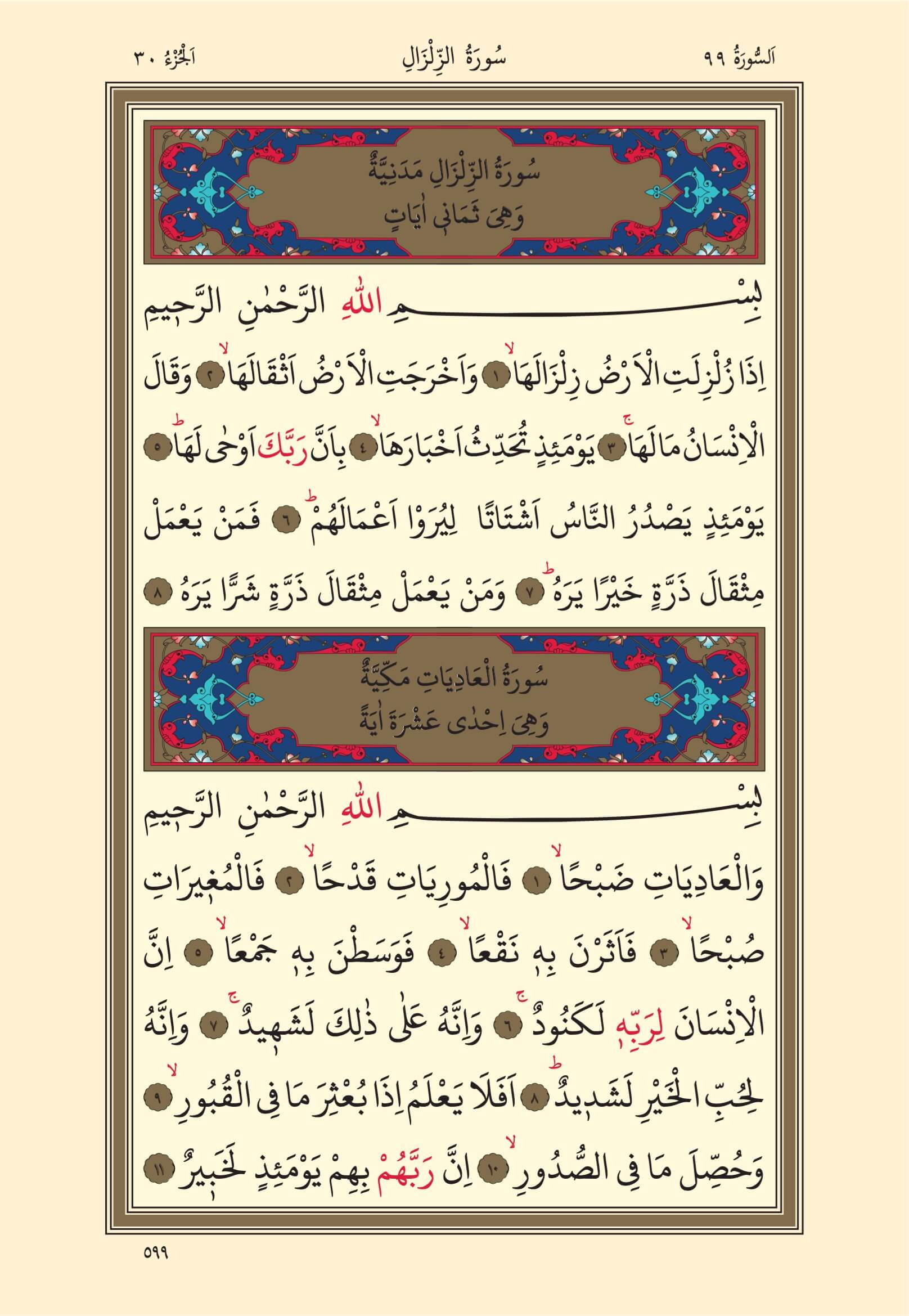 Zilzal, Adiyat Sureleri – 599. Sayfa, – 30. Cüz - 4. Hizb