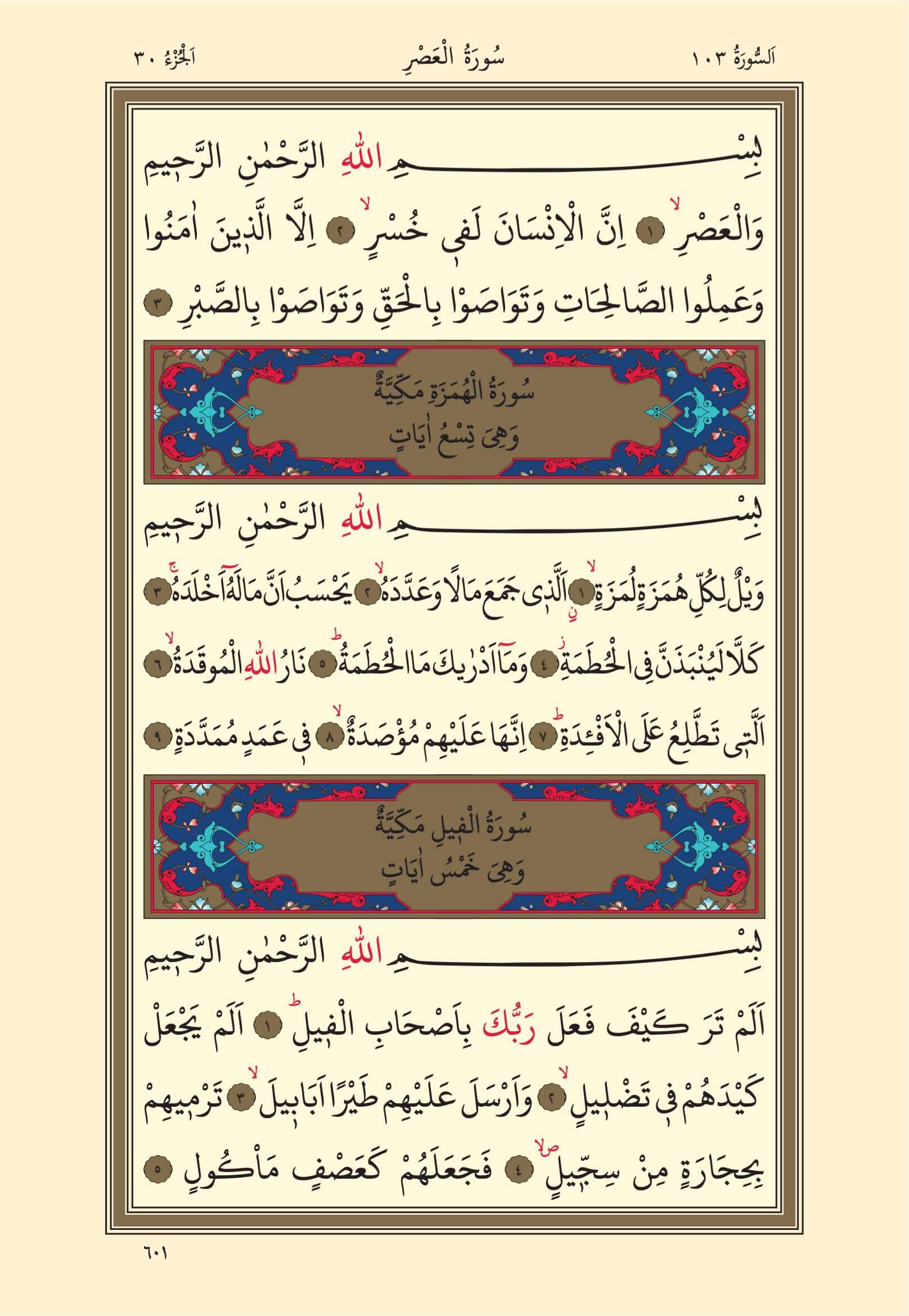 Asr, Hümeze ve Fil Sureleri – 601. Sayfa, – 30. Cüz - 4. Hizb